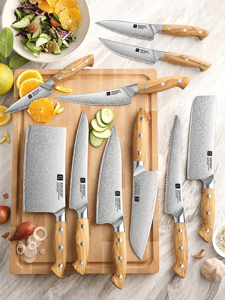 XINZUO 10 PCS Kitchen Knife Set - Triple-Layer Composited Steel with Olive Wood Handle, Razor Sharp & Ergonomic Design-PIN Series